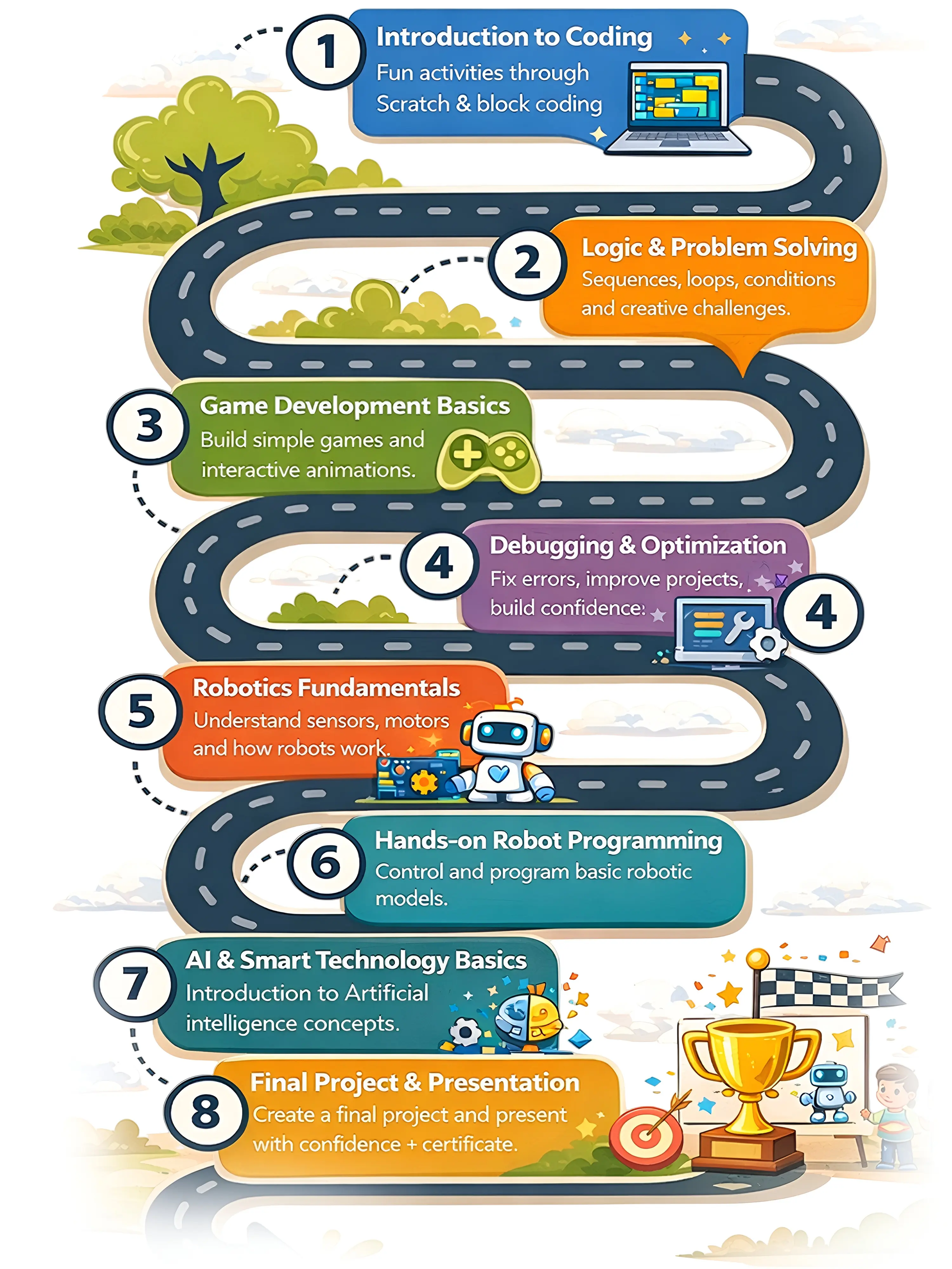 No prior coding experience is required. Our step-by-step teaching approach makes it easy for beginners to start confidently. Students are grouped into age-based batches (7–10 | 11–14) to ensure comfortable and effective learning.