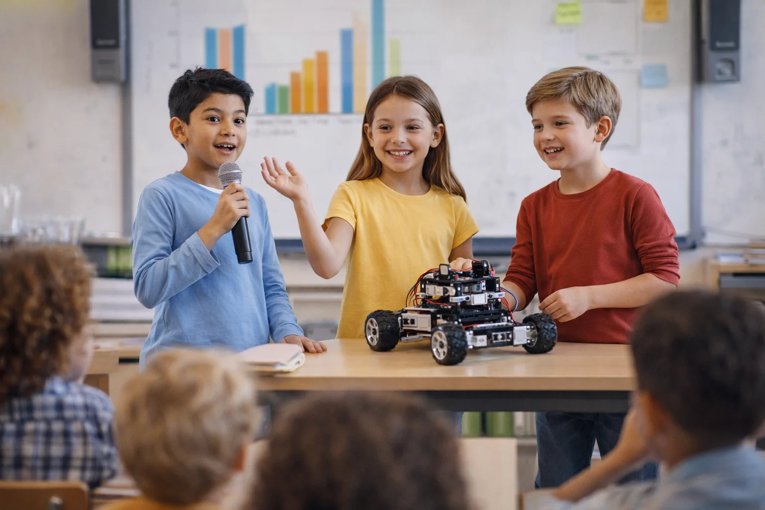 On the final day, students present their projects. This experience helps boost confidence, improve communication skills, and develop stage presence naturally.